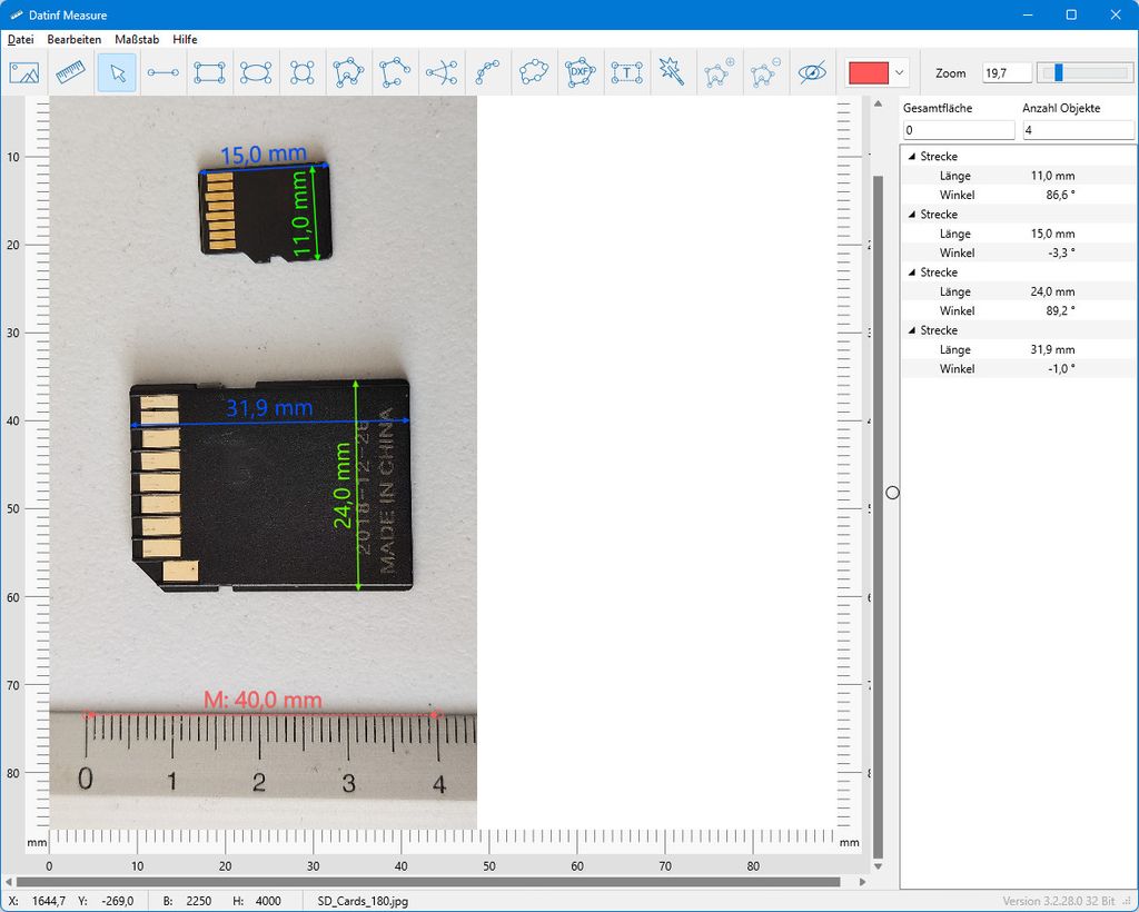 Nachdem ein Bild geladen wurde, muss der Maßstab mithilfe eines Bildelements bekannter Größe festgelegt werden. Dat-inf Measure bietet eine Auswahl an vektorbasierten Messobjekten, die ähnlich wie in Zeichenprogrammen über das Originalbild gelegt werden. Diese Objekte liefern sofort die entsprechenden Längen- oder Flächenwerte.